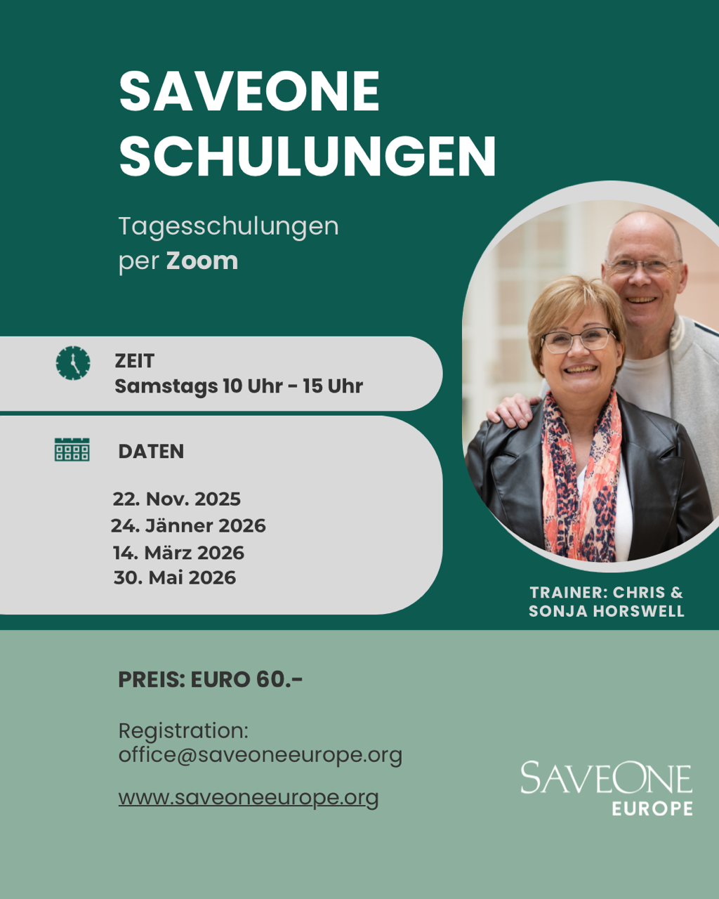 Chris & Sonja Horswell – Direktoren von SaveOne Europe werden dich an einem der Schulungstage von 10 Uhr – 15 Uhr schulen, Lebensberichte von Frauen und Männern auf Video zeigen, SaveOne und das effektive 10 Schritte Programm im Detail erklären.
